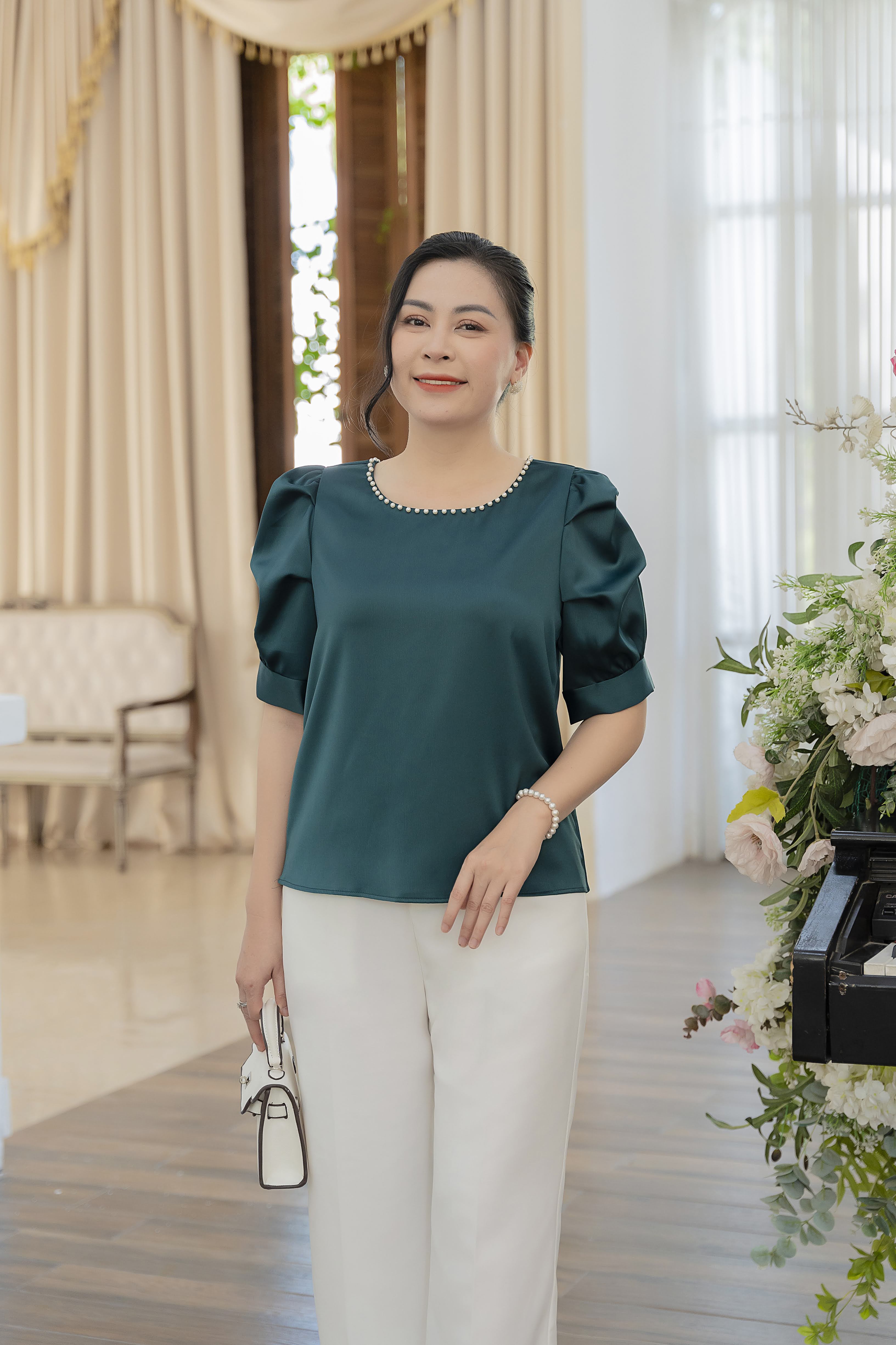 • Thiết kế áo trung niên dáng suông rộng, tay kiểu kết ngọc, cổ tròn, chất liệu lụa mịn mát không co giãn nhưng vẫn tạo được cảm giác thoải mái.