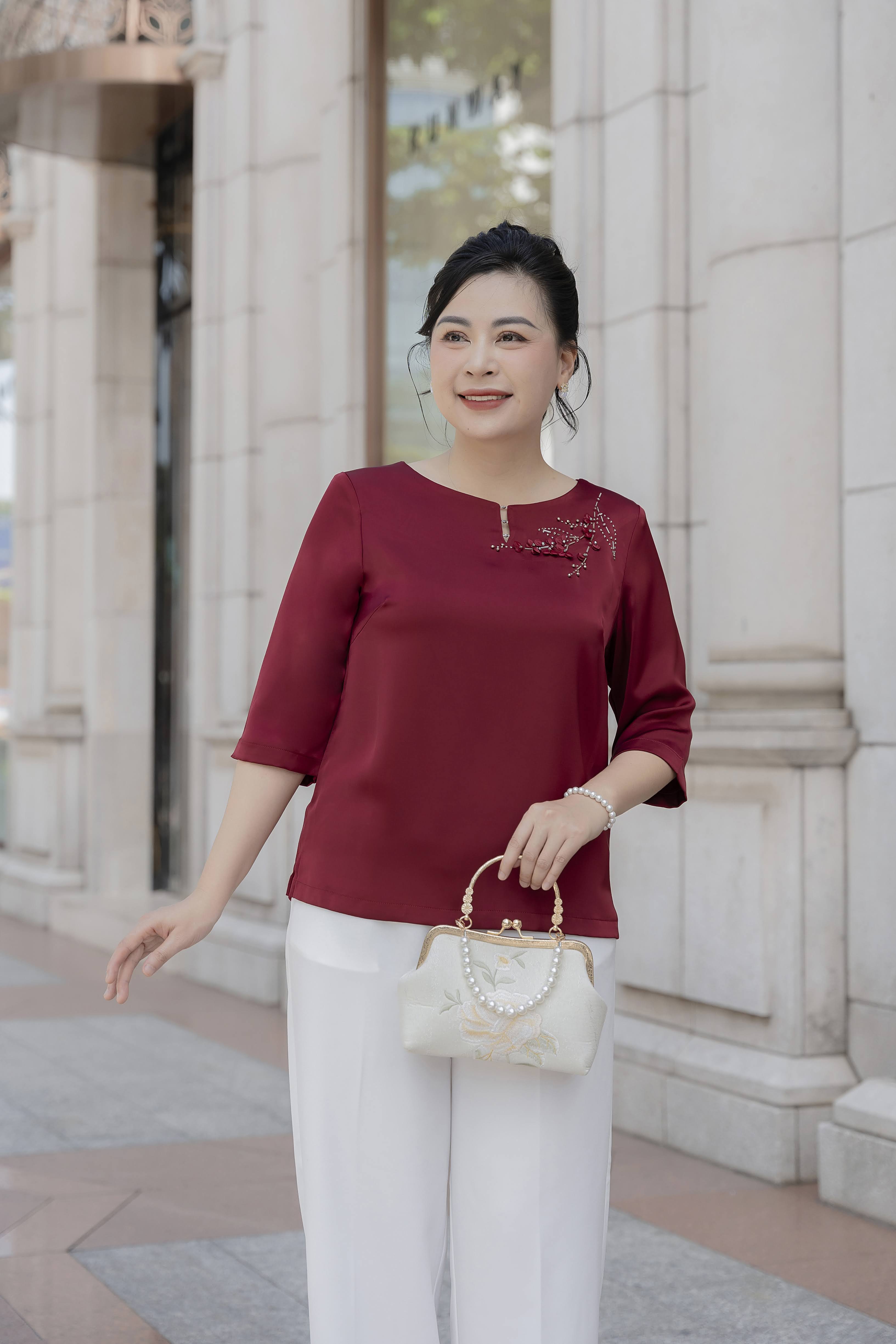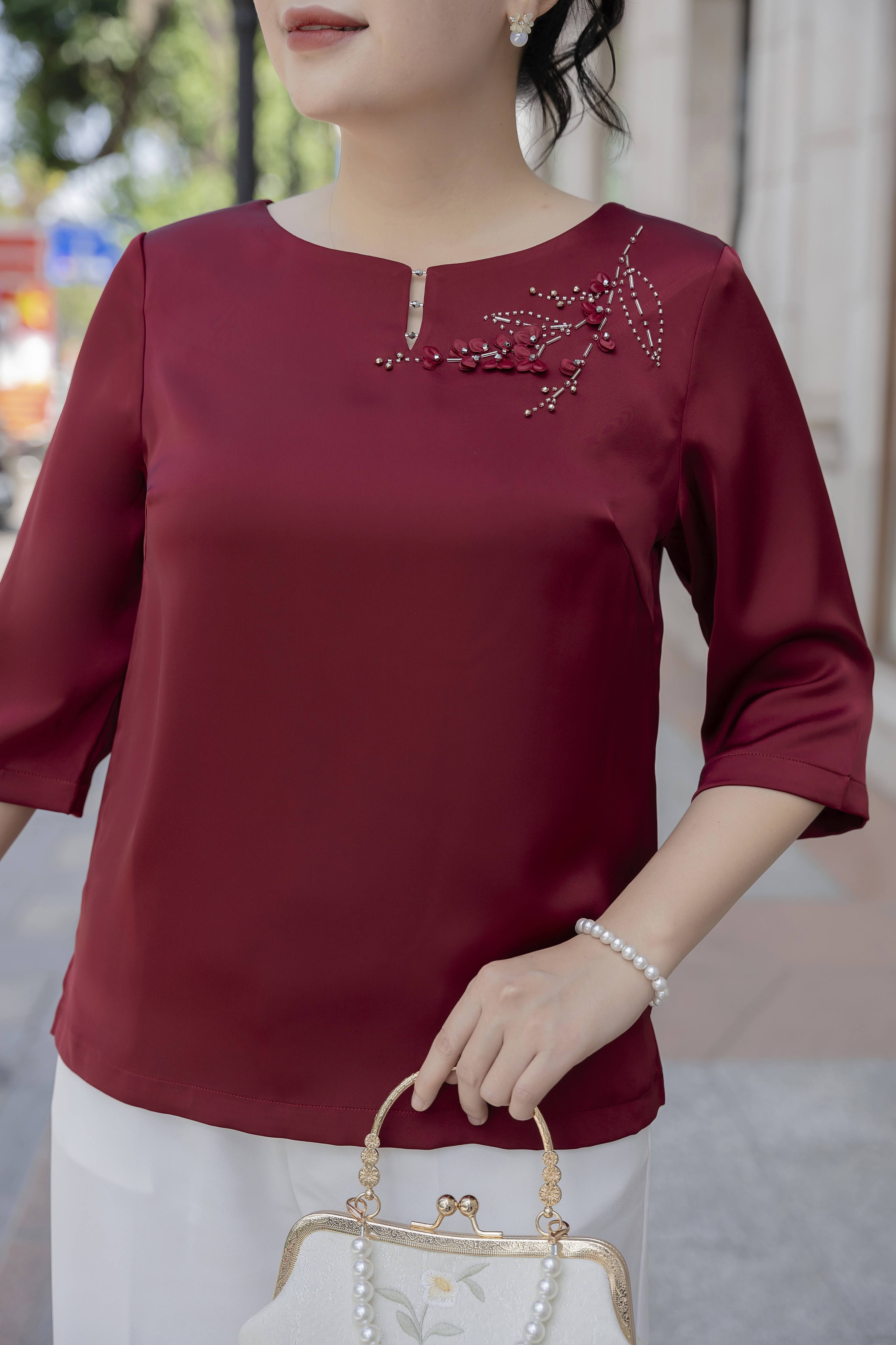 GUMOM Áo Kiểu Trung Niên U50 U60 Cao Cấp Cổ Tròn Tay Lỡ Thêu Hoa Đính thủ công hoa và đá pha lê cap cấp Sang Trọng Cho Nữ