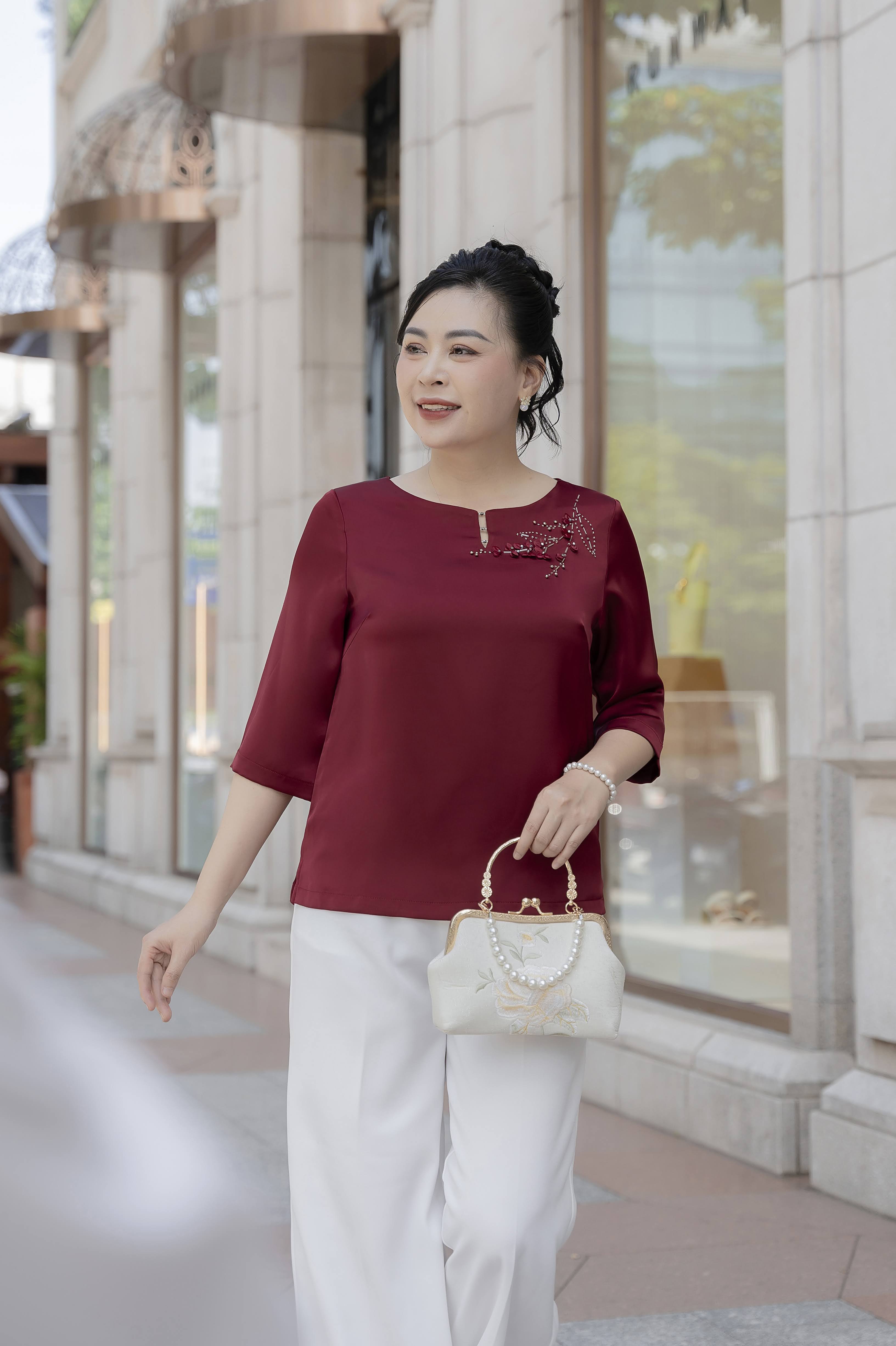 GUMOM Áo Kiểu Trung Niên U50 U60 Cao Cấp Cổ Tròn Tay Lỡ Thêu Hoa Đính thủ công hoa và đá pha lê cap cấp Sang Trọng Cho Nữ