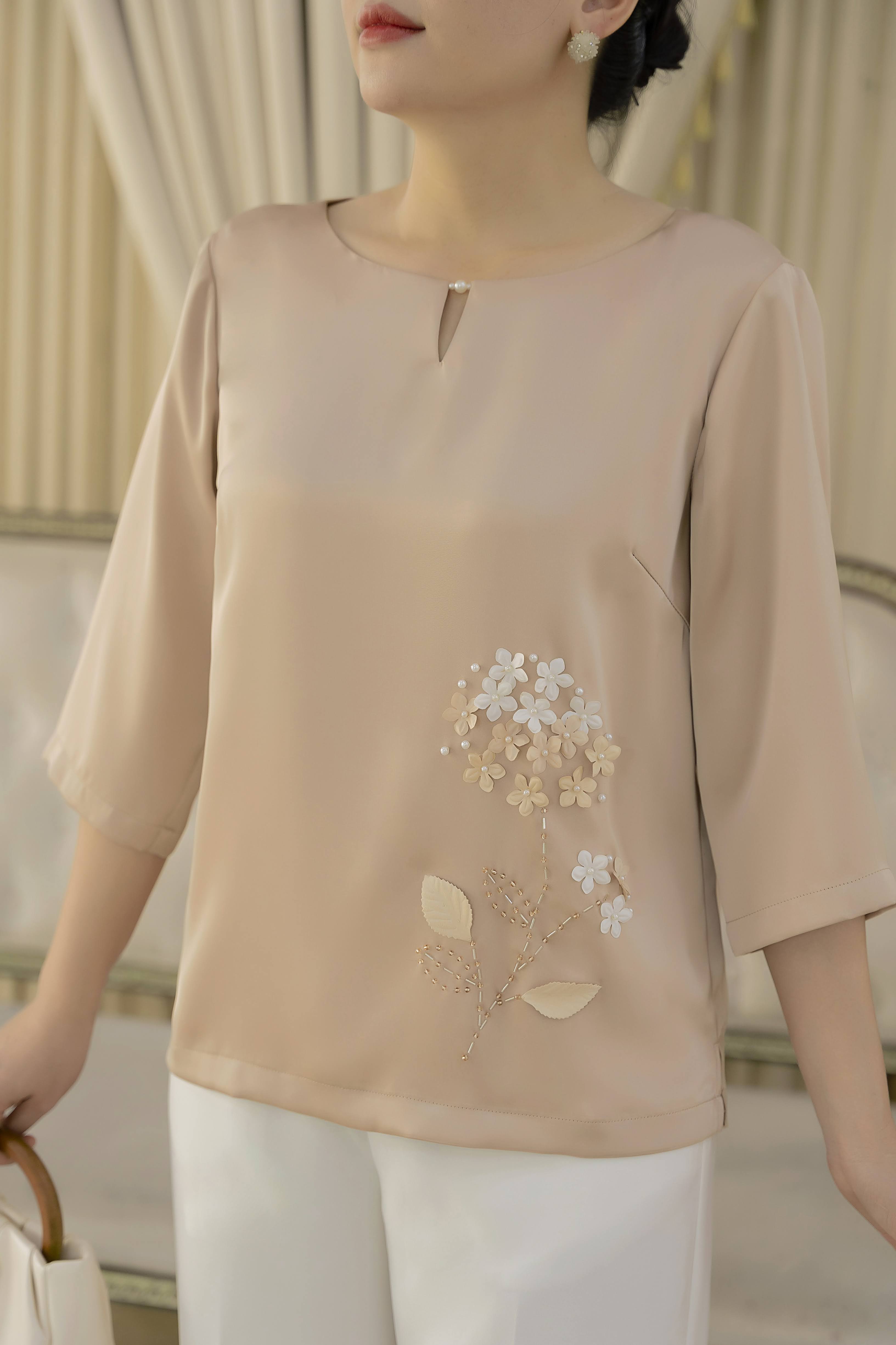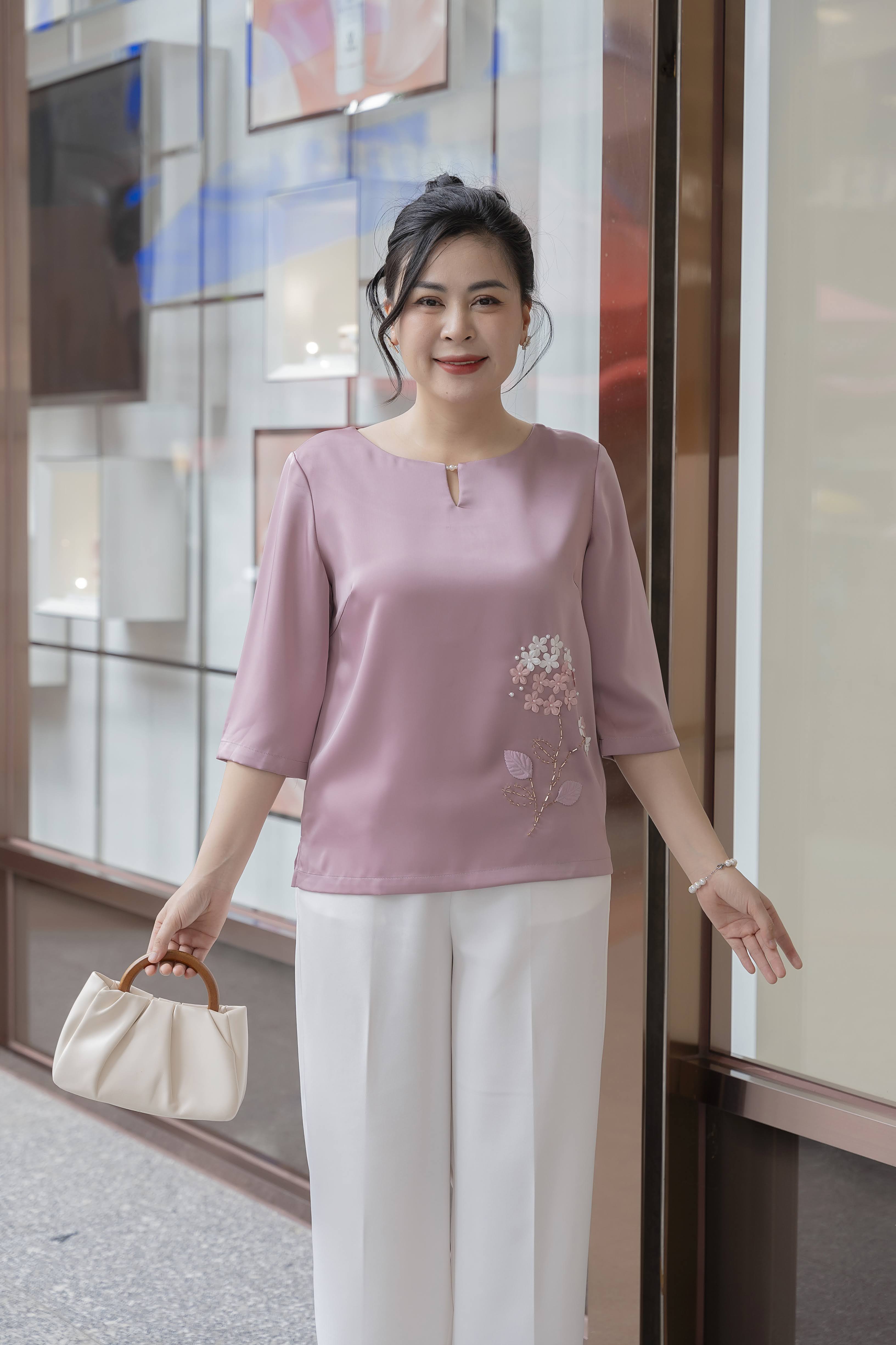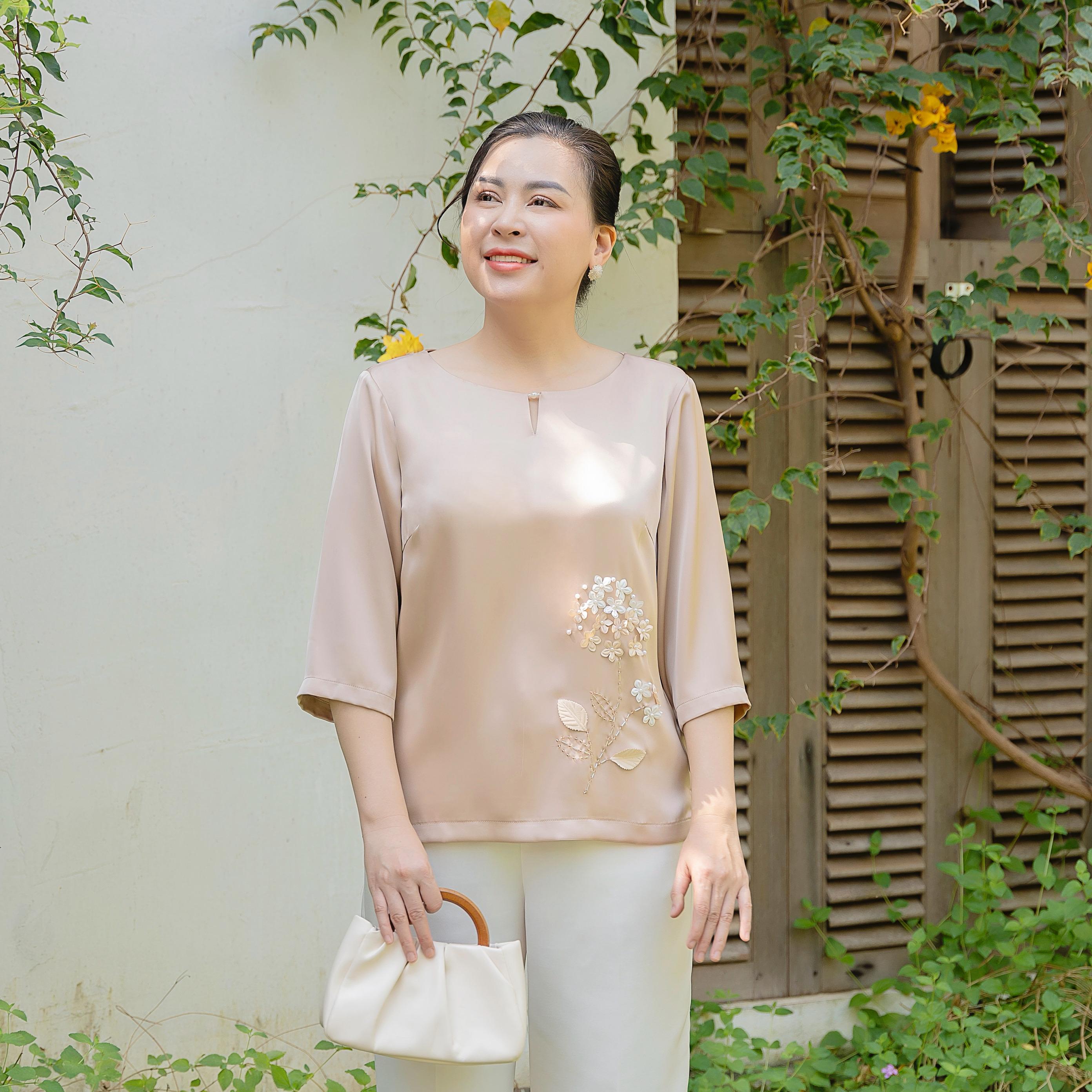 GUMOM Áo Kiểu Trung Niên U50 U60 Cao Cấp Cổ Tròn Tay Lỡ đính kết hoa thủ công Sang Trọng Cho Nữ