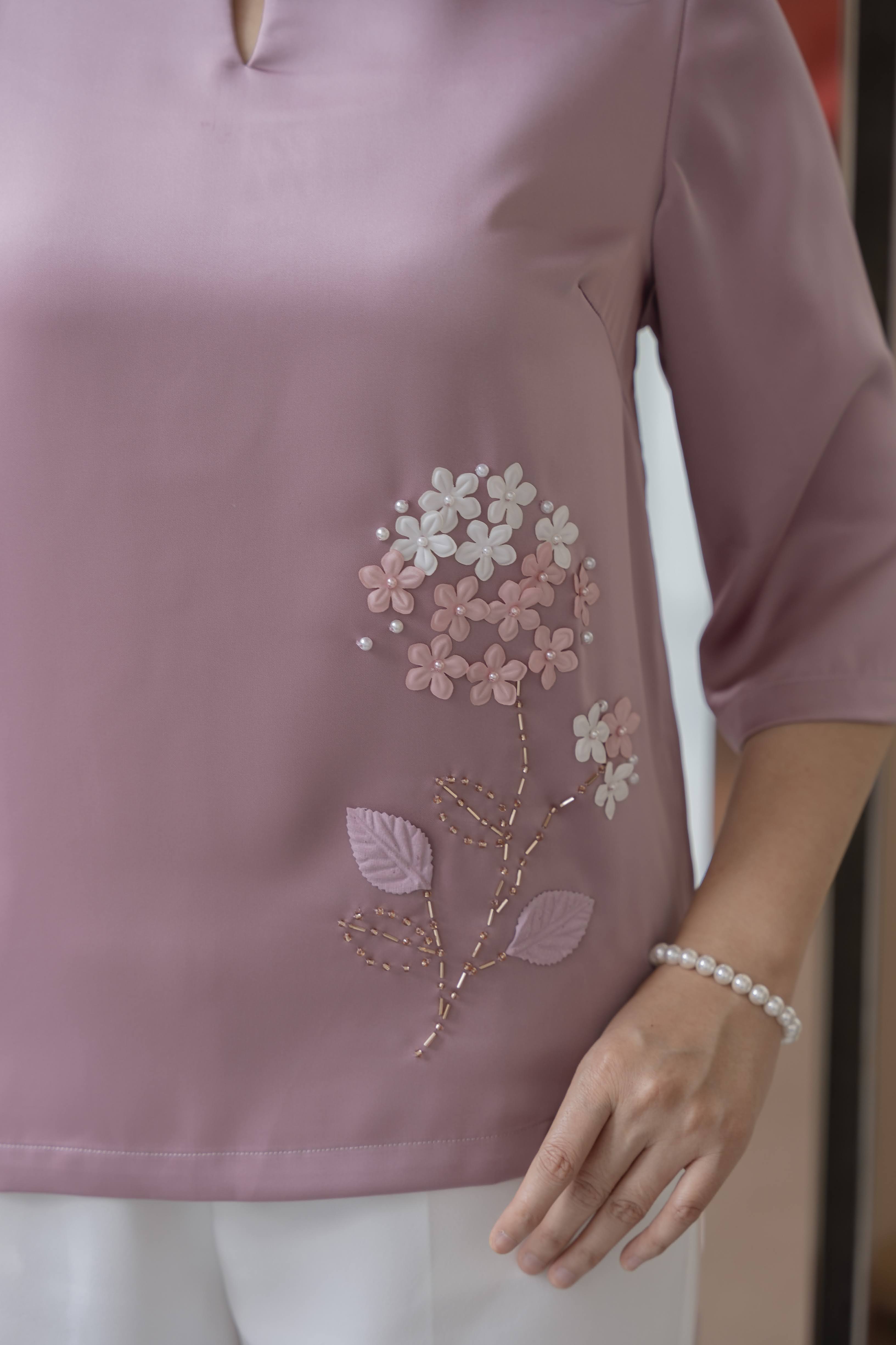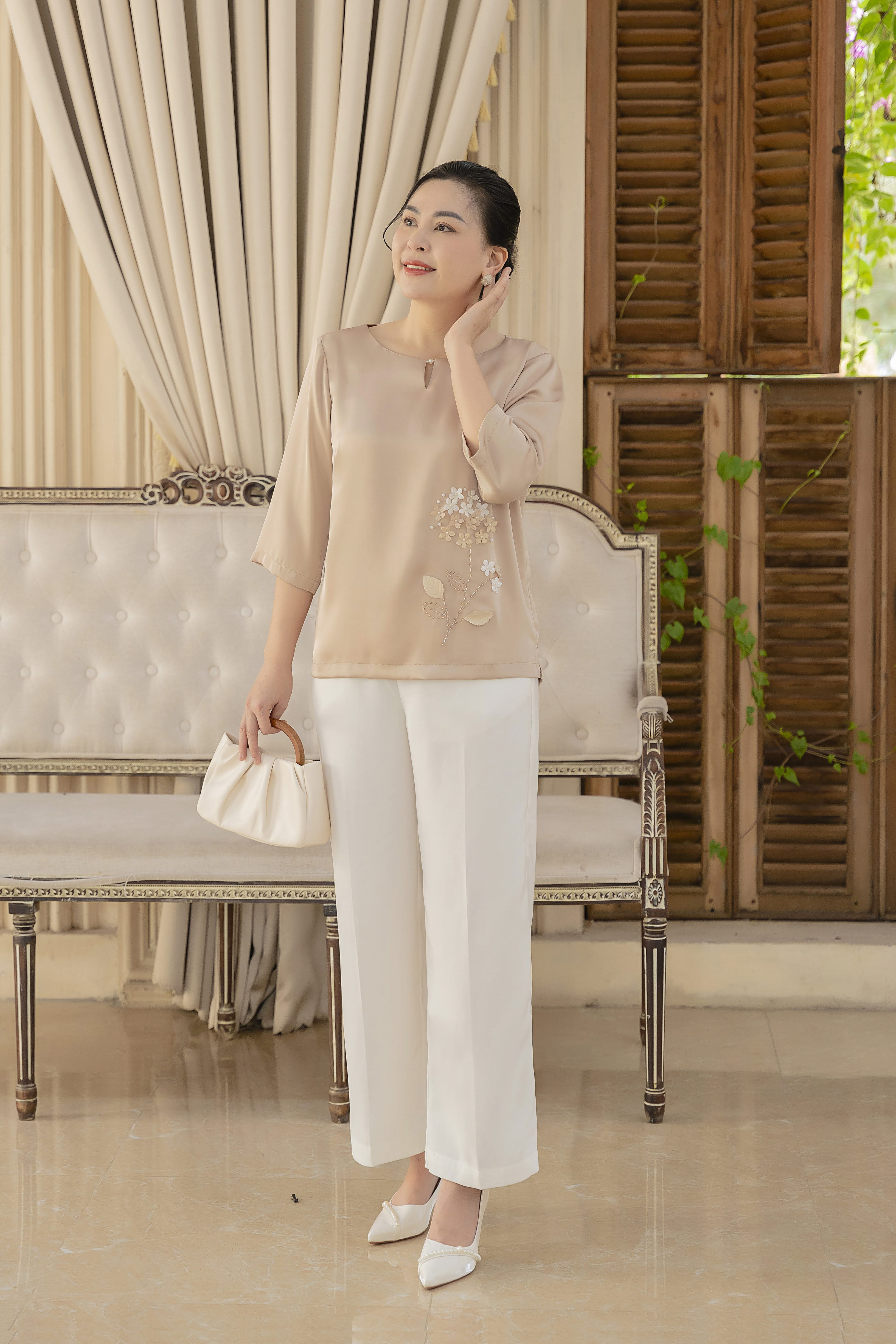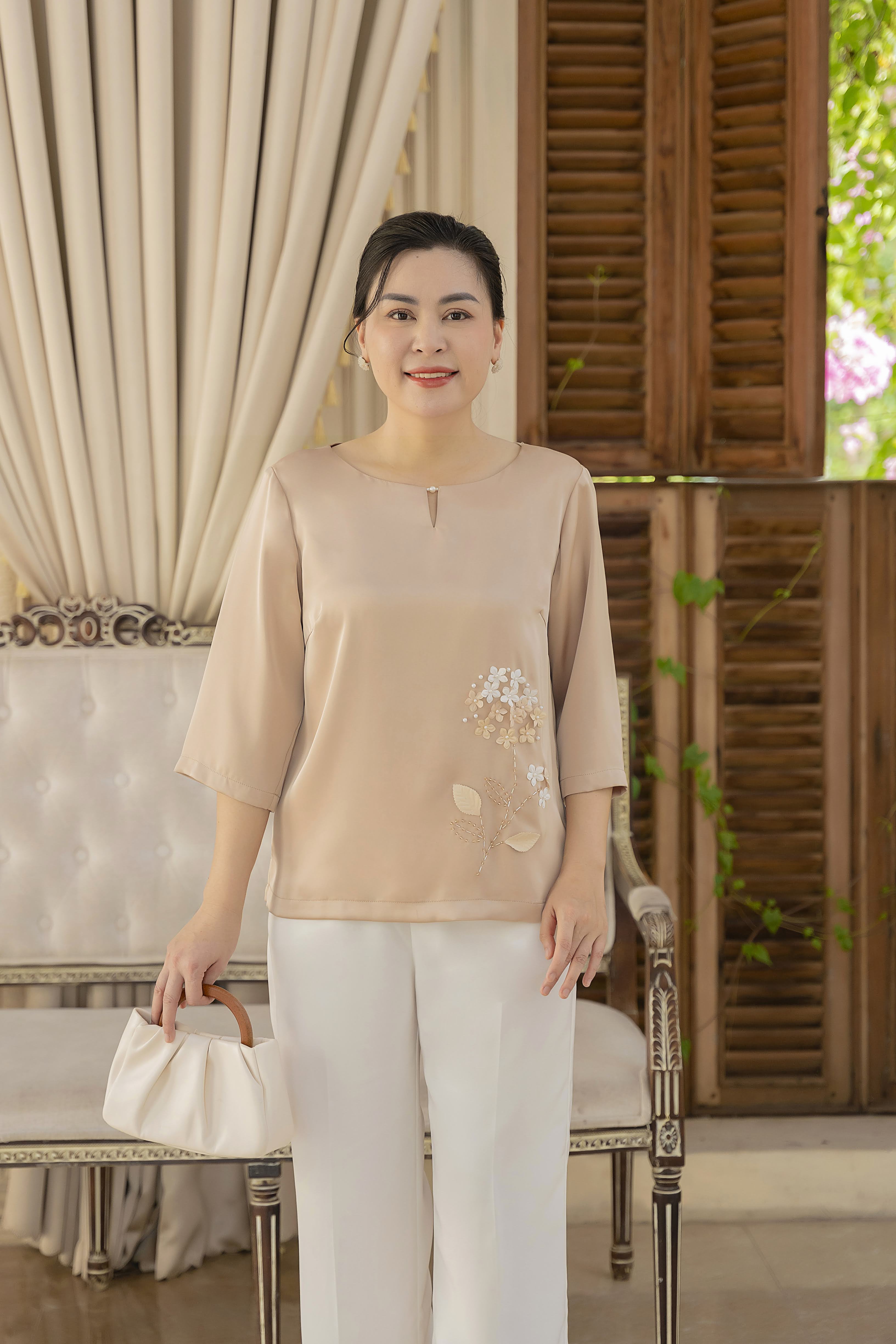 GUMOM Áo Kiểu Trung Niên U50 U60 Cao Cấp Cổ Tròn Tay Lỡ đính kết hoa thủ công Sang Trọng Cho Nữ