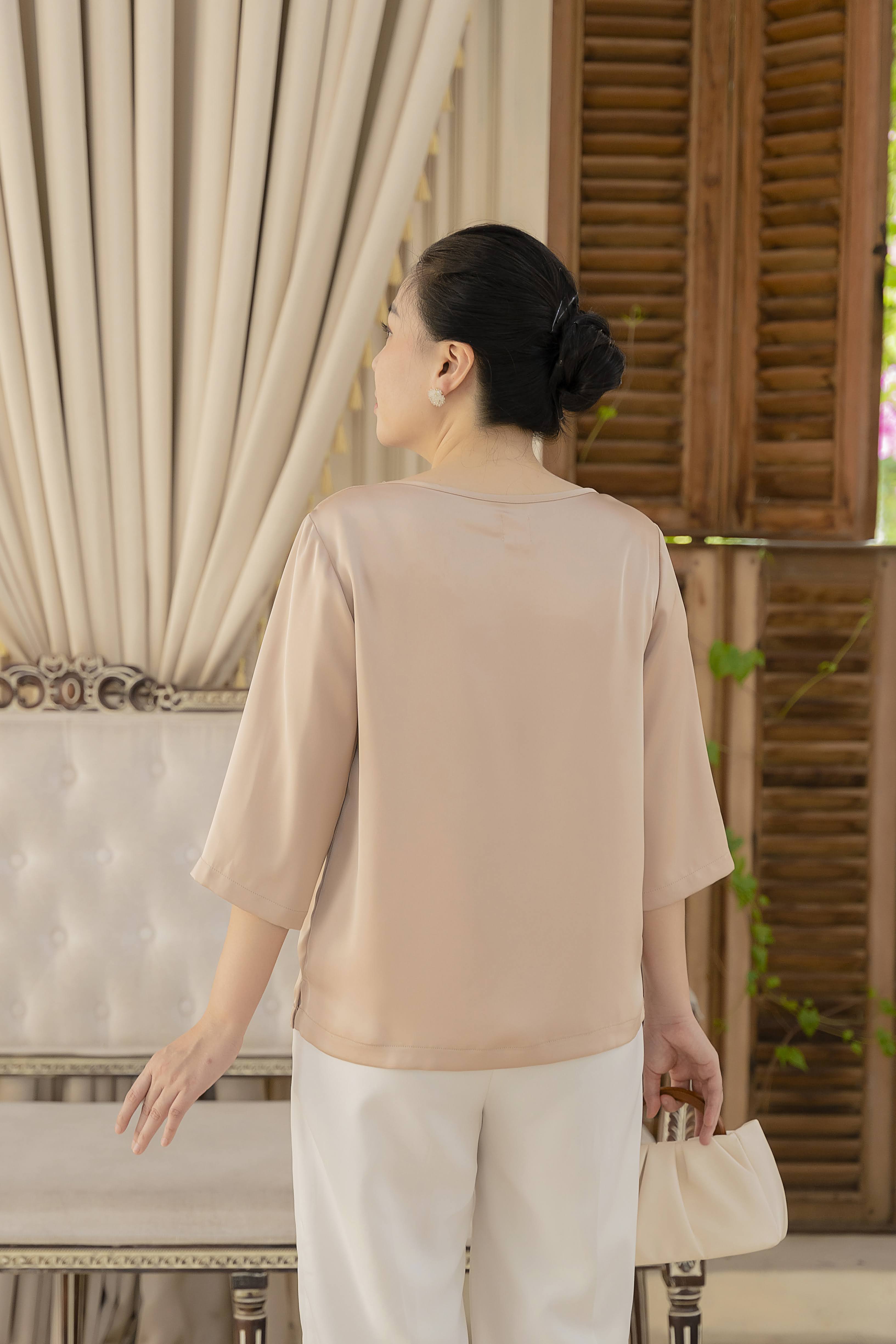 • Thiết kế áo trung niên dáng suông rộng, tay lỡ, cổ tròn, chất liệu lụa mịn mát không co giãn nhưng vẫn tạo được cảm giác thoải mái.