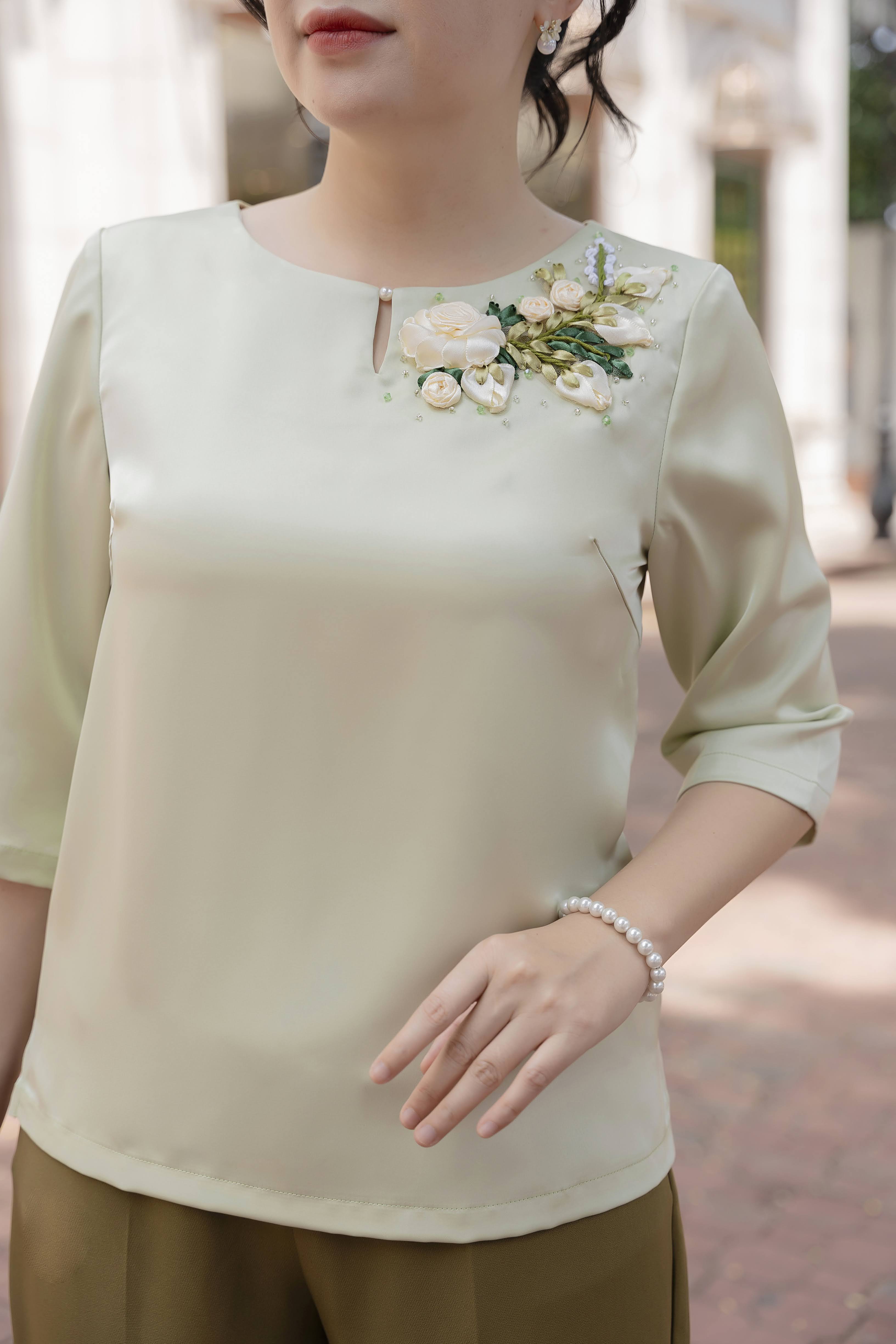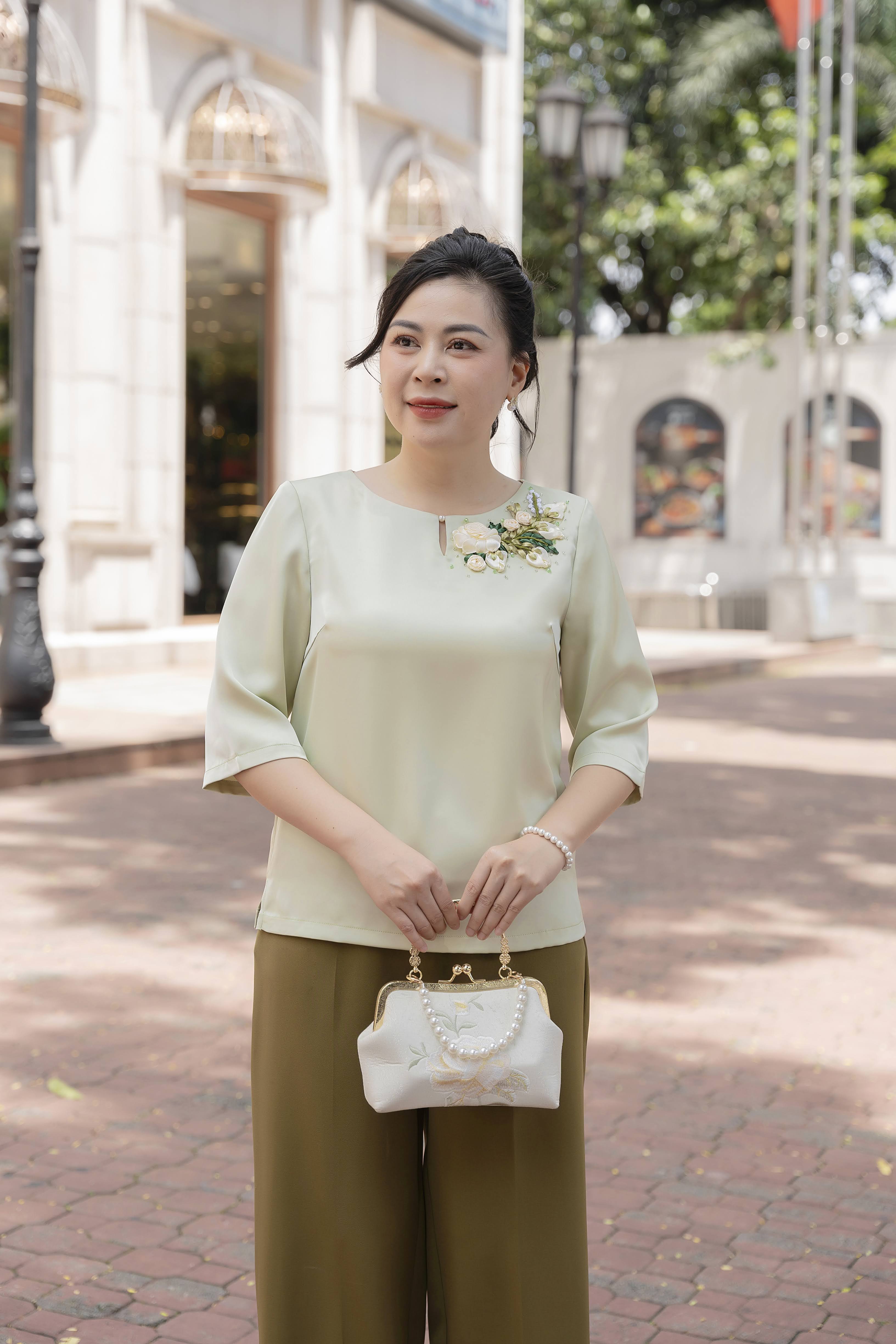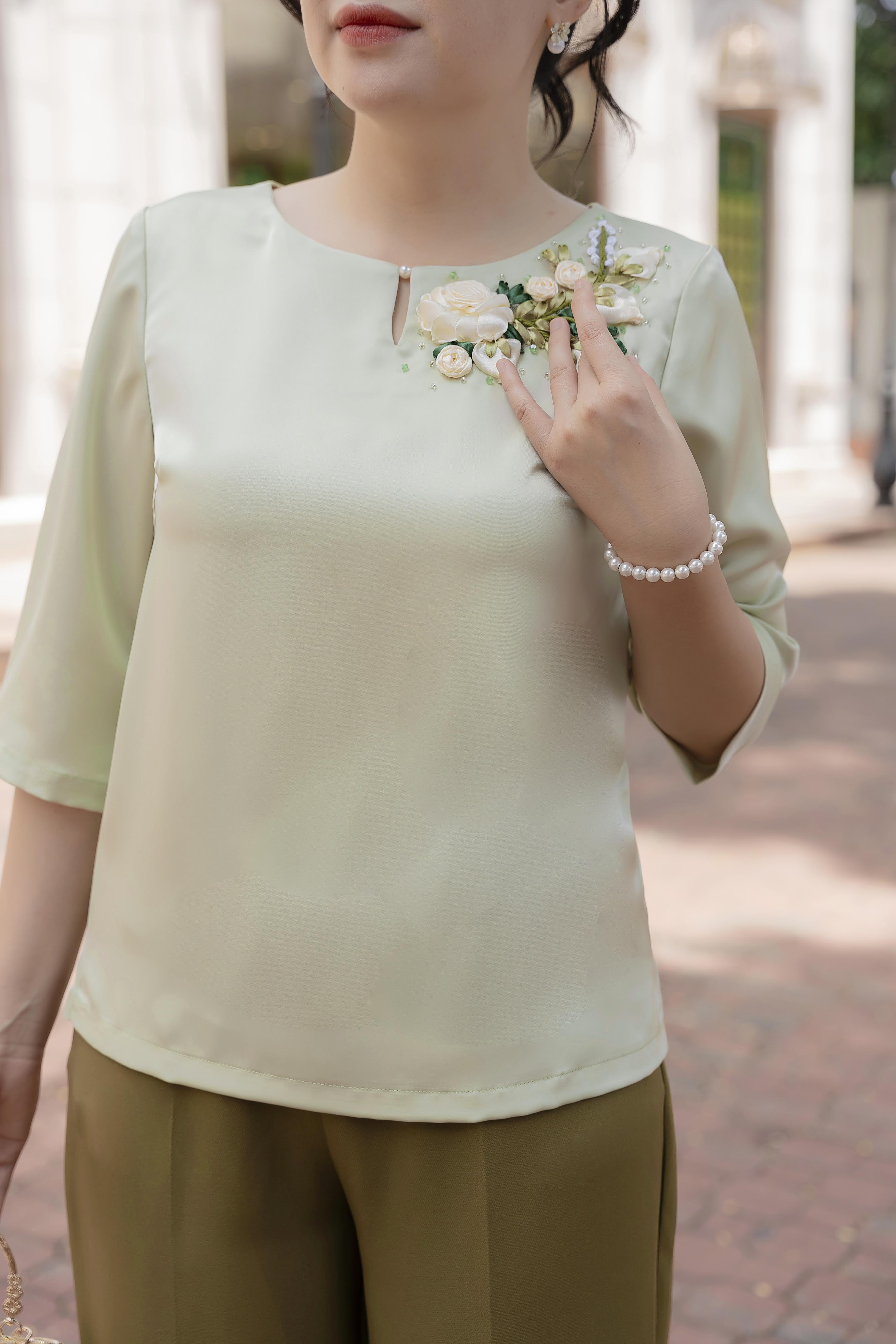 GUMOM Áo Kiểu Trung Niên U50 U60 Cao Cấp Cổ Tròn Tay Lỡ Thêu Hoa Ruy Băng thủ công cao cấp Sang Trọng Cho Nữ