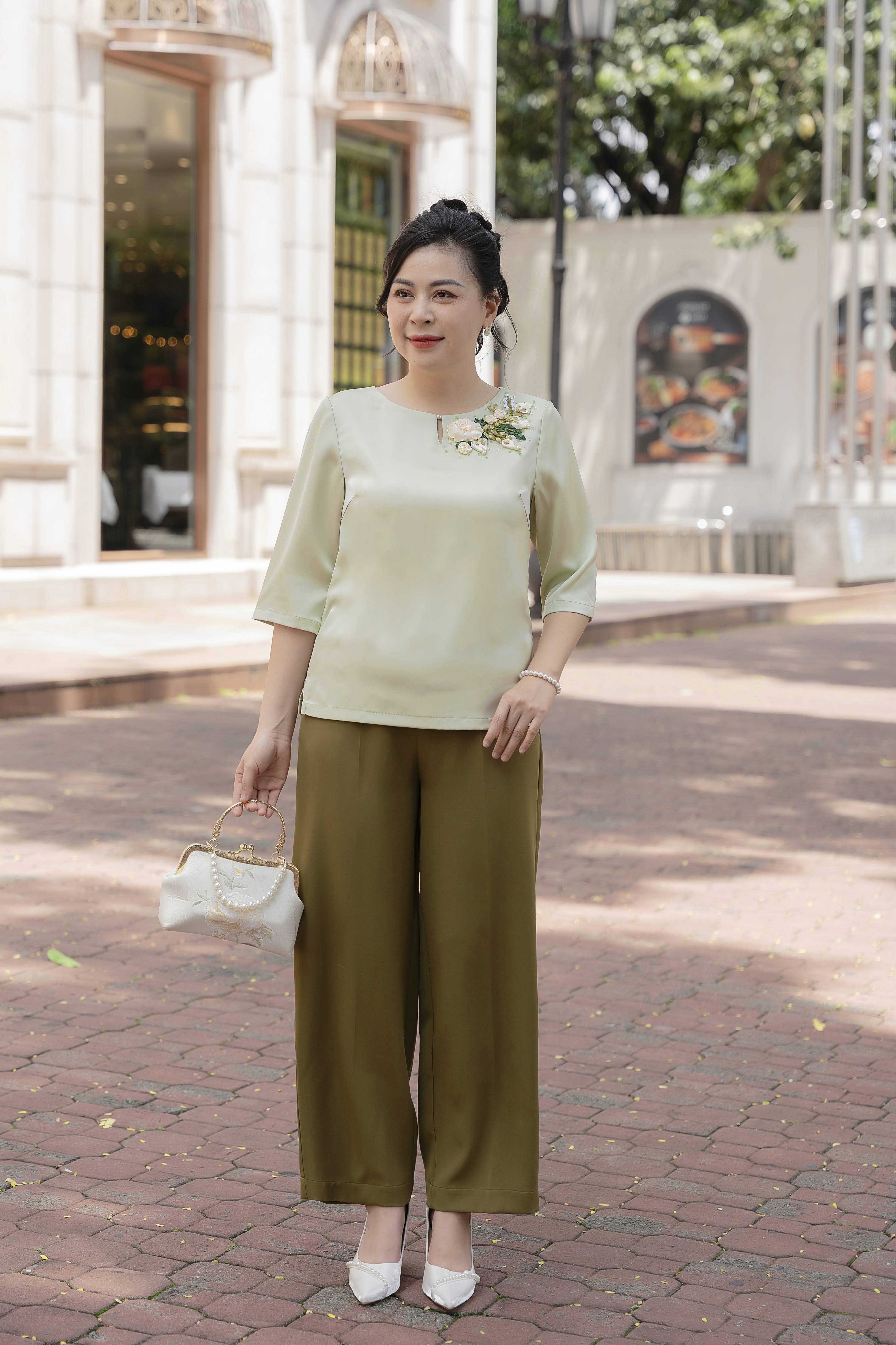 • Thiết kế áo trung niên dáng suông rộng, tay lỡ, cổ tròn, chất liệu lụa mịn mát không co giãn nhưng vẫn tạo được cảm giác thoải mái.