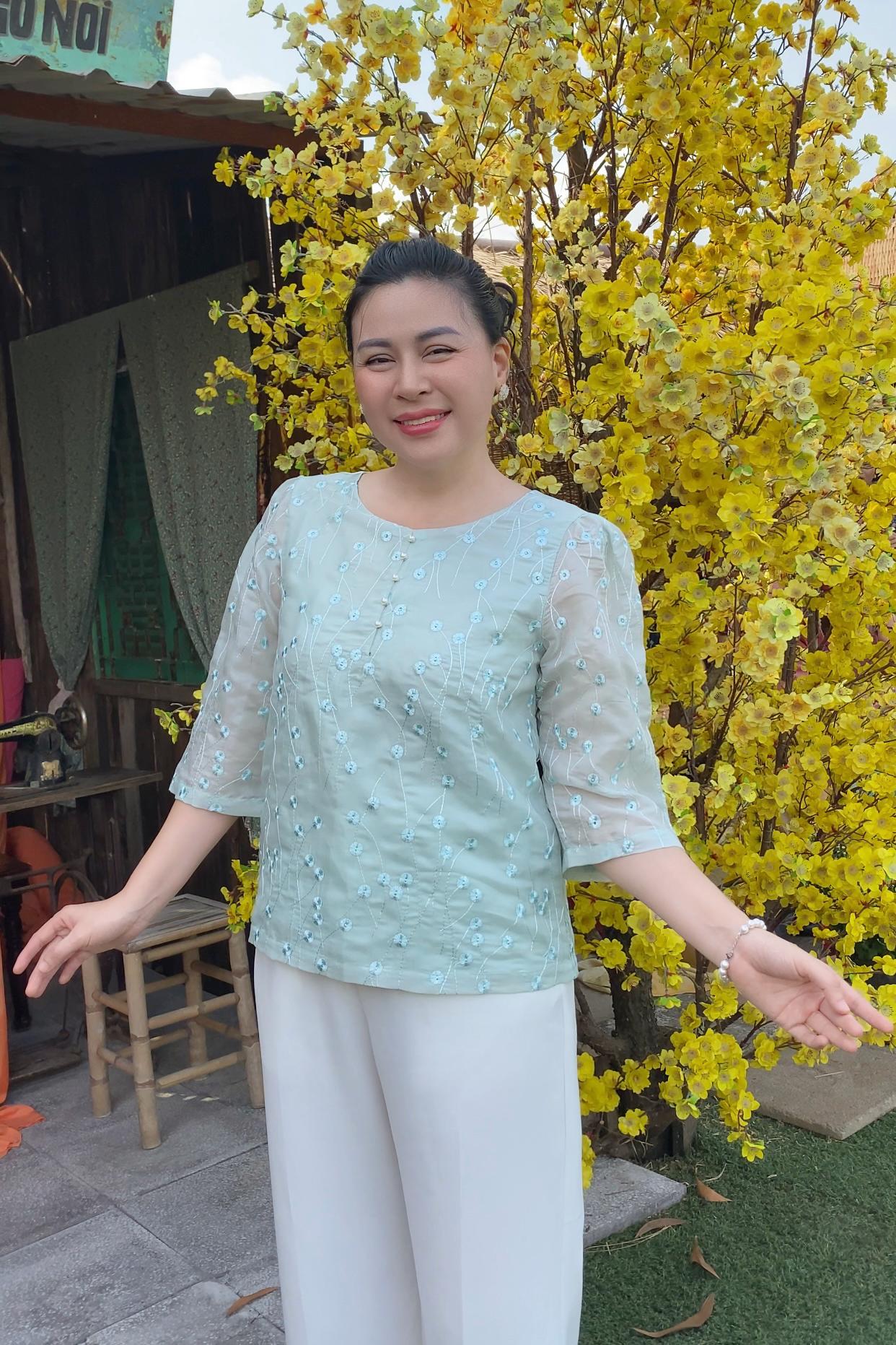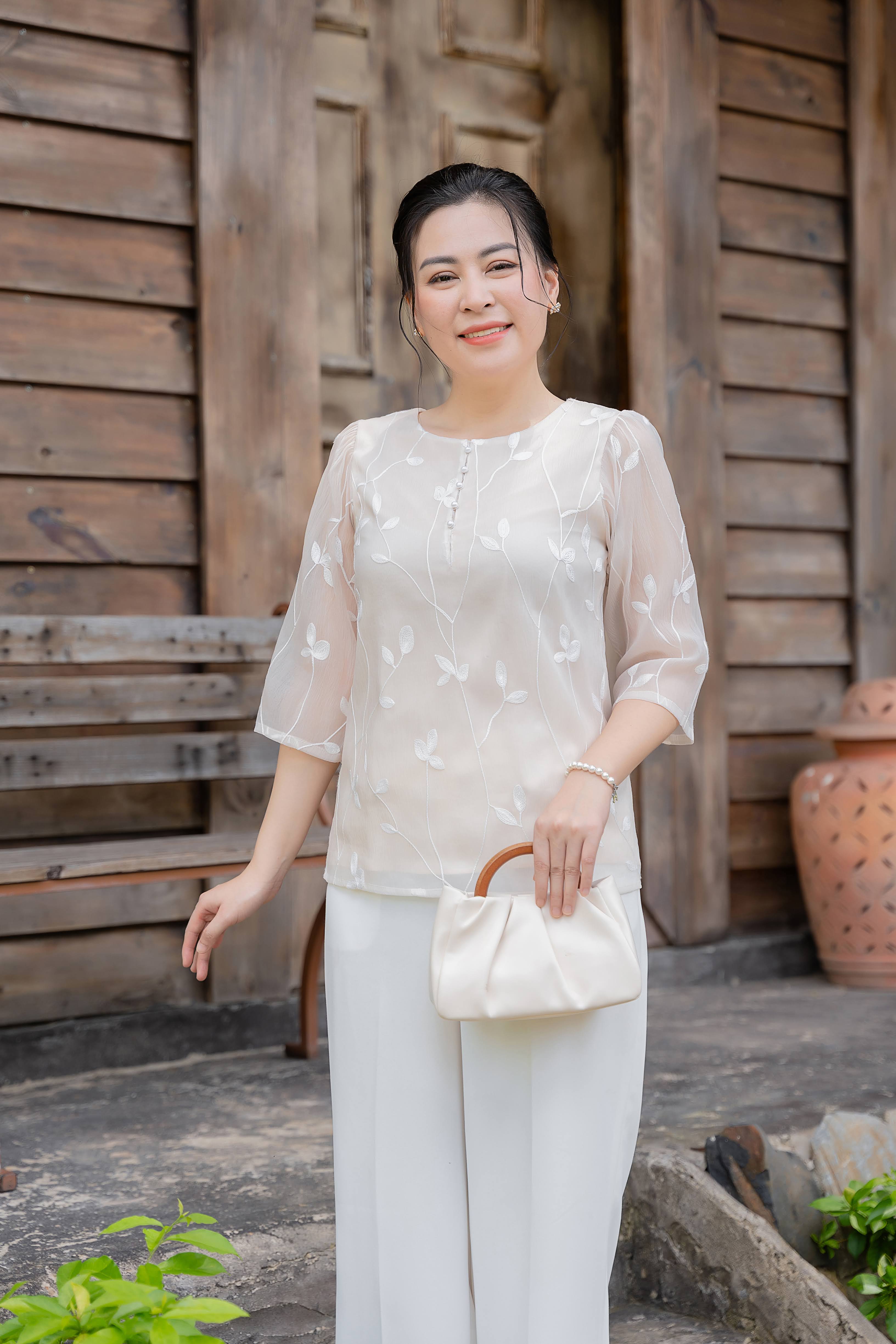 GUMOM Áo Kiểu Trung Niên U50 U60 Cao Cấp Cổ Tròn Tay Lỡ Thêu Hoa Đính Nút Sang Trọng Cho Nữ