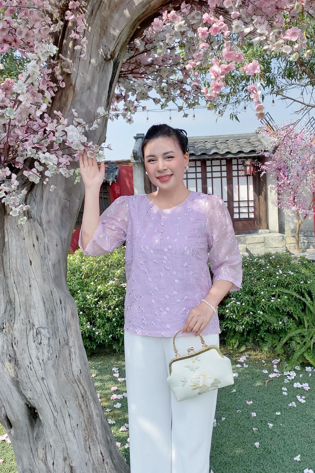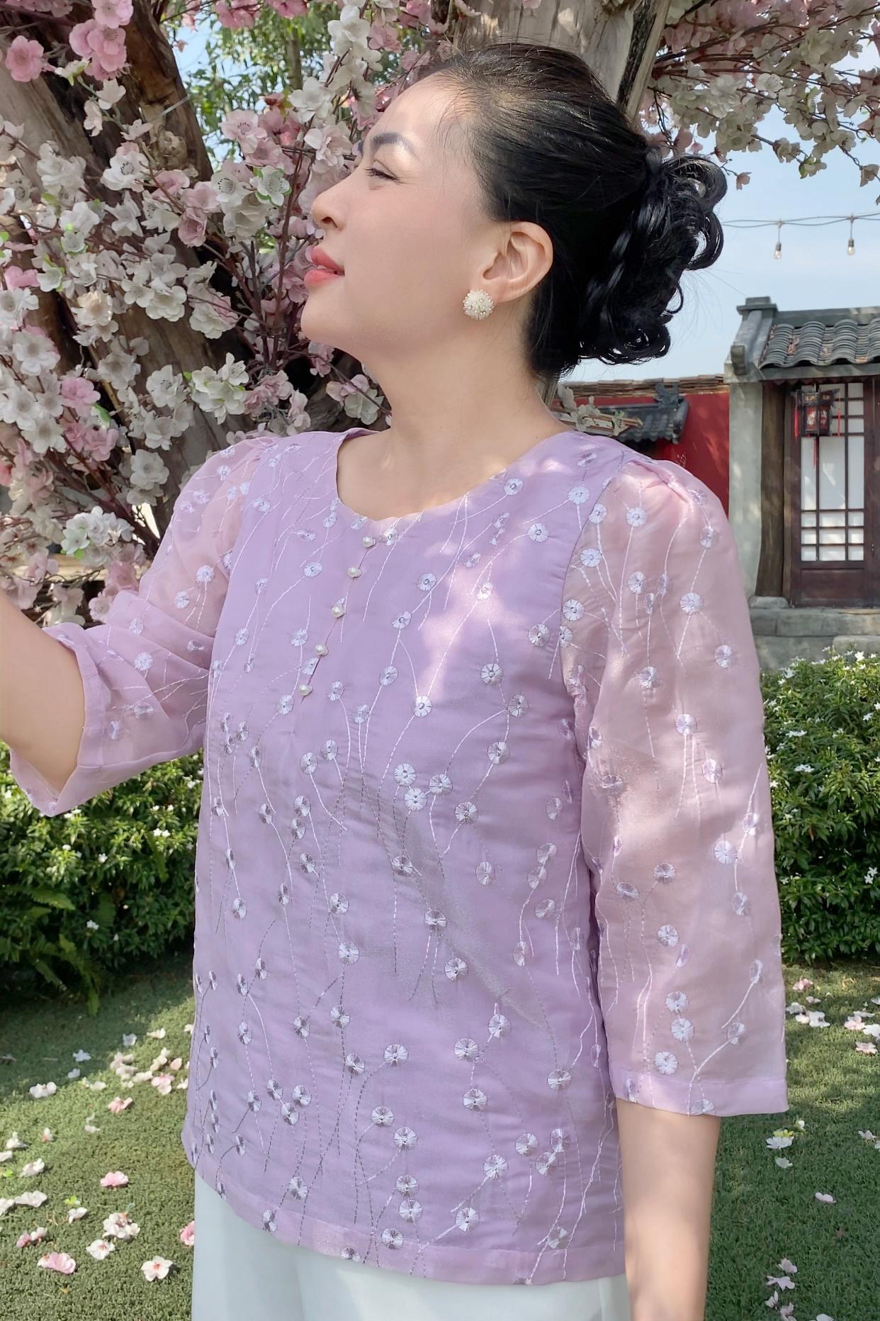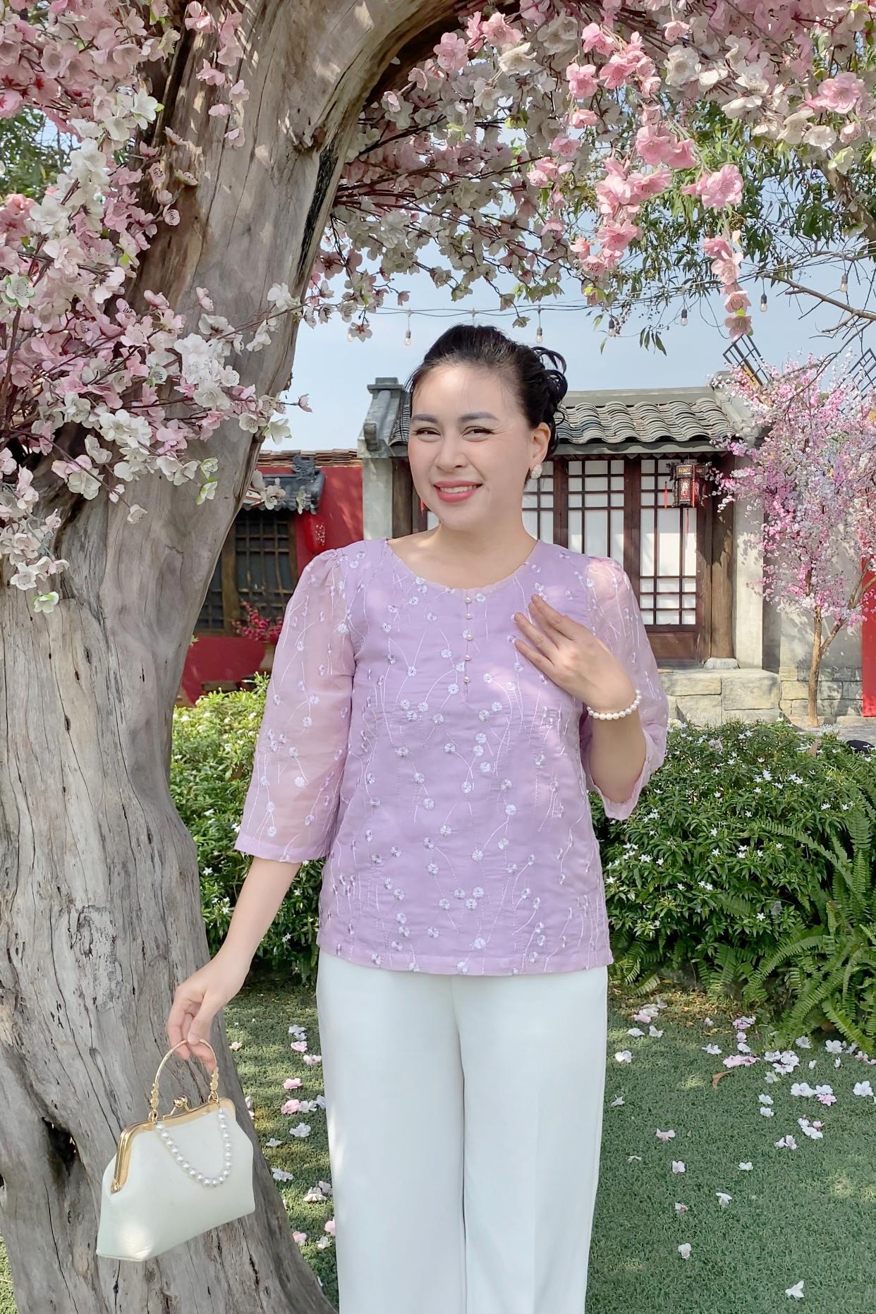 GUMOM - Áo Kiểu Trung Niên U50 U60 Cao Cấp Cổ Tròn Tay Lỡ Thêu Hoa Sang Trọng Cho Nữ - Women Nhung Kem Nho