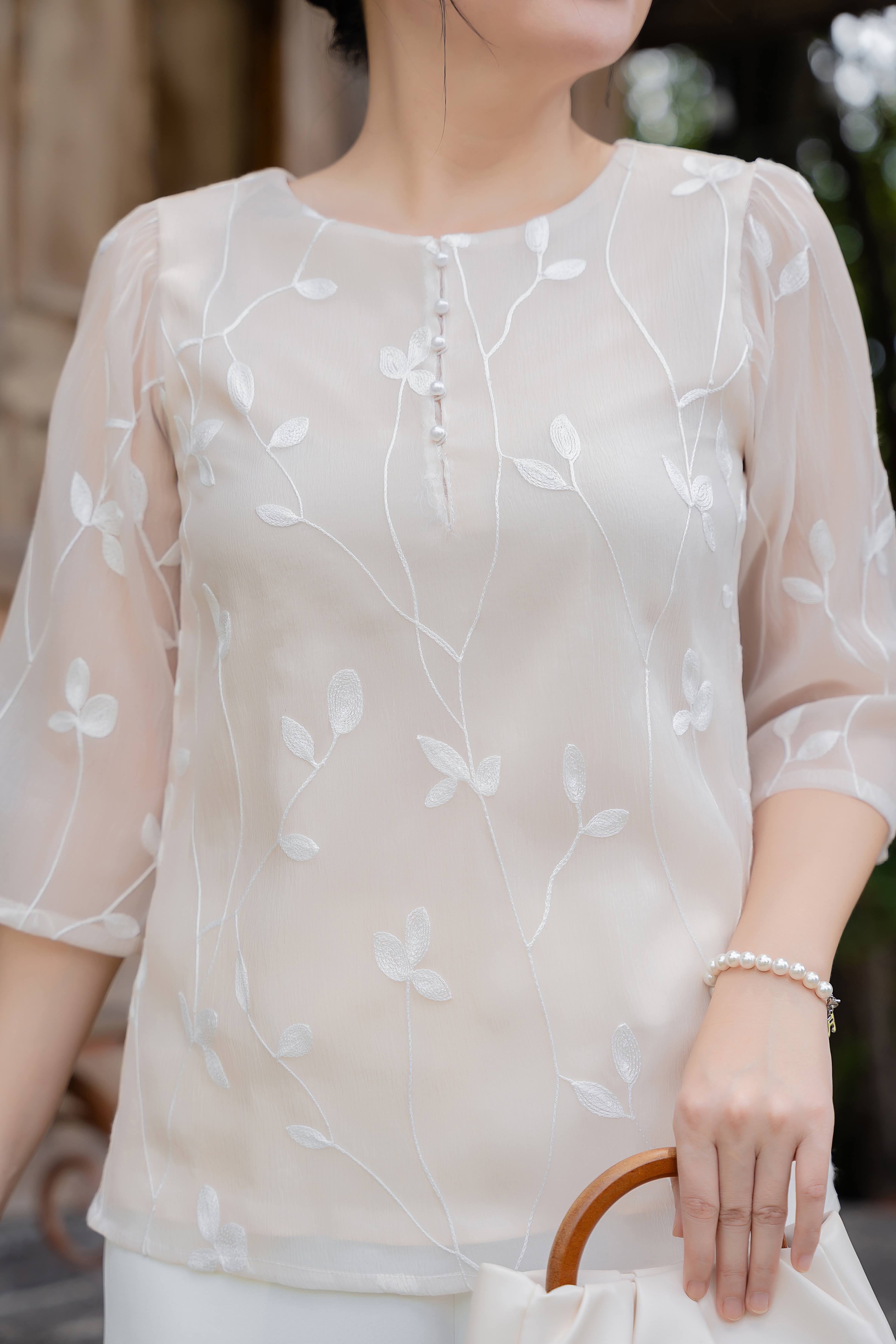 GUMOM Áo Kiểu Trung Niên U50 U60 Cao Cấp Cổ Tròn Tay Lỡ Thêu Hoa Đính Nút Sang Trọng Cho Nữ
