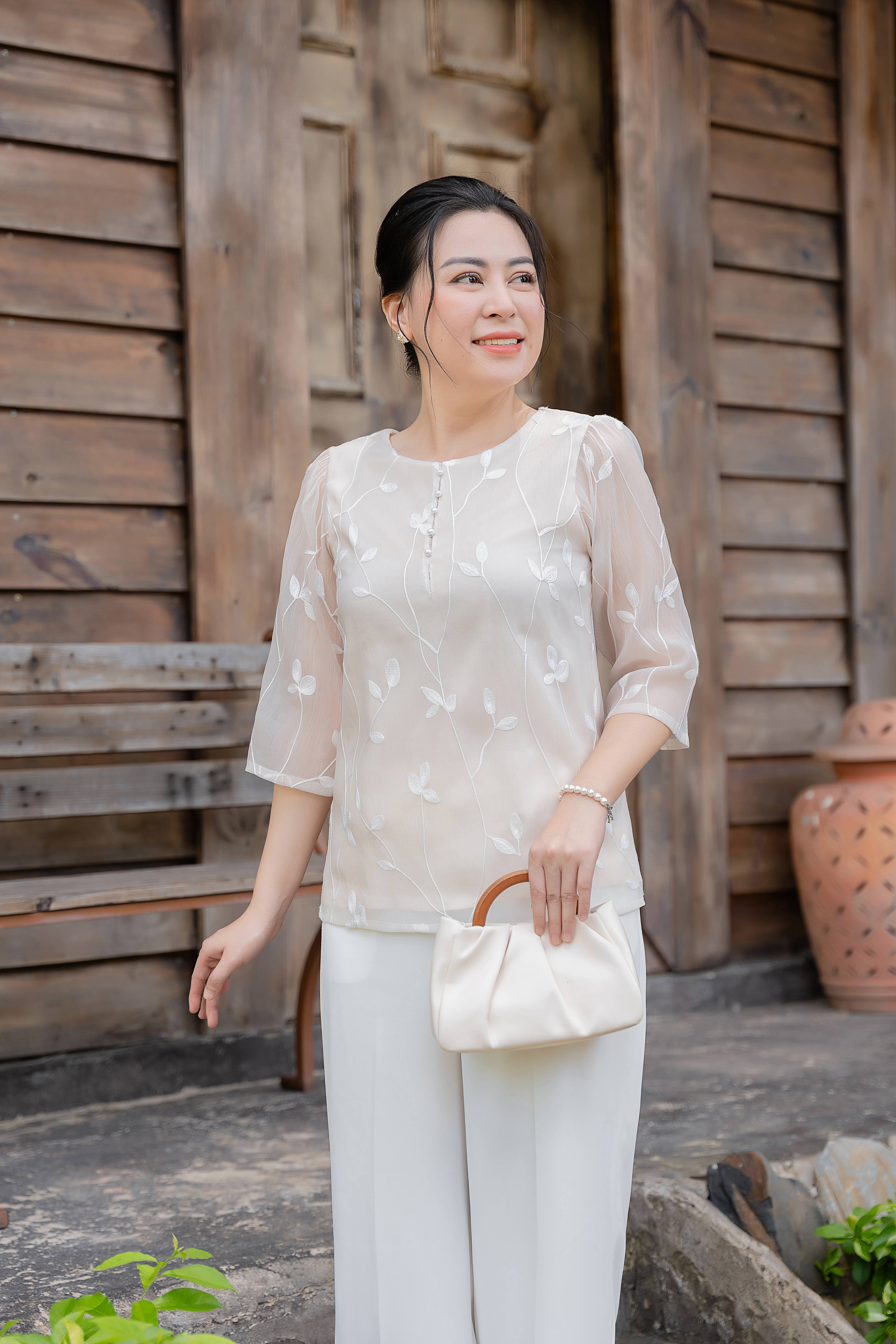 GUMOM - Áo Kiểu Trung Niên U50 U60 Cao Cấp Cổ Tròn Tay Lỡ Thêu Hoa Sang Trọng Cho Nữ - Women Nhung Kem Nho